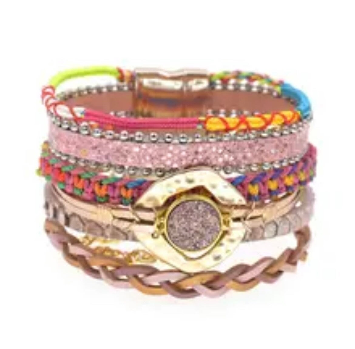 Stijlvol & speels. Diverse bandjes waaronder van leer gecombineerd in 1 armband. Een echte eyecatcher! De sluiting is een magneet.
