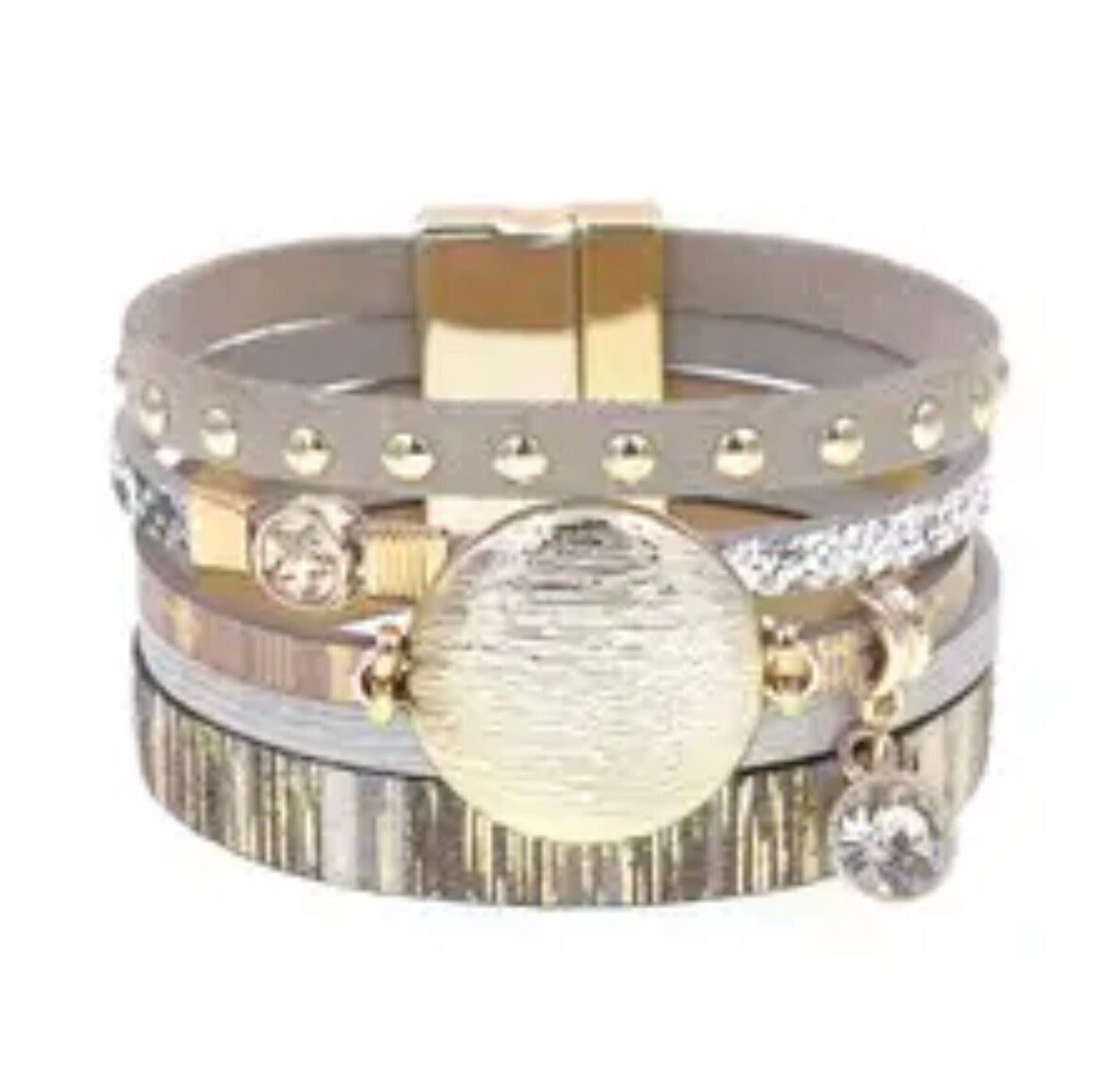 Stijlvol & speels. Diverse bandjes waaronder van leer gecombineerd in 1 armband. Een echte eyecatcher! De sluiting is een magneet.