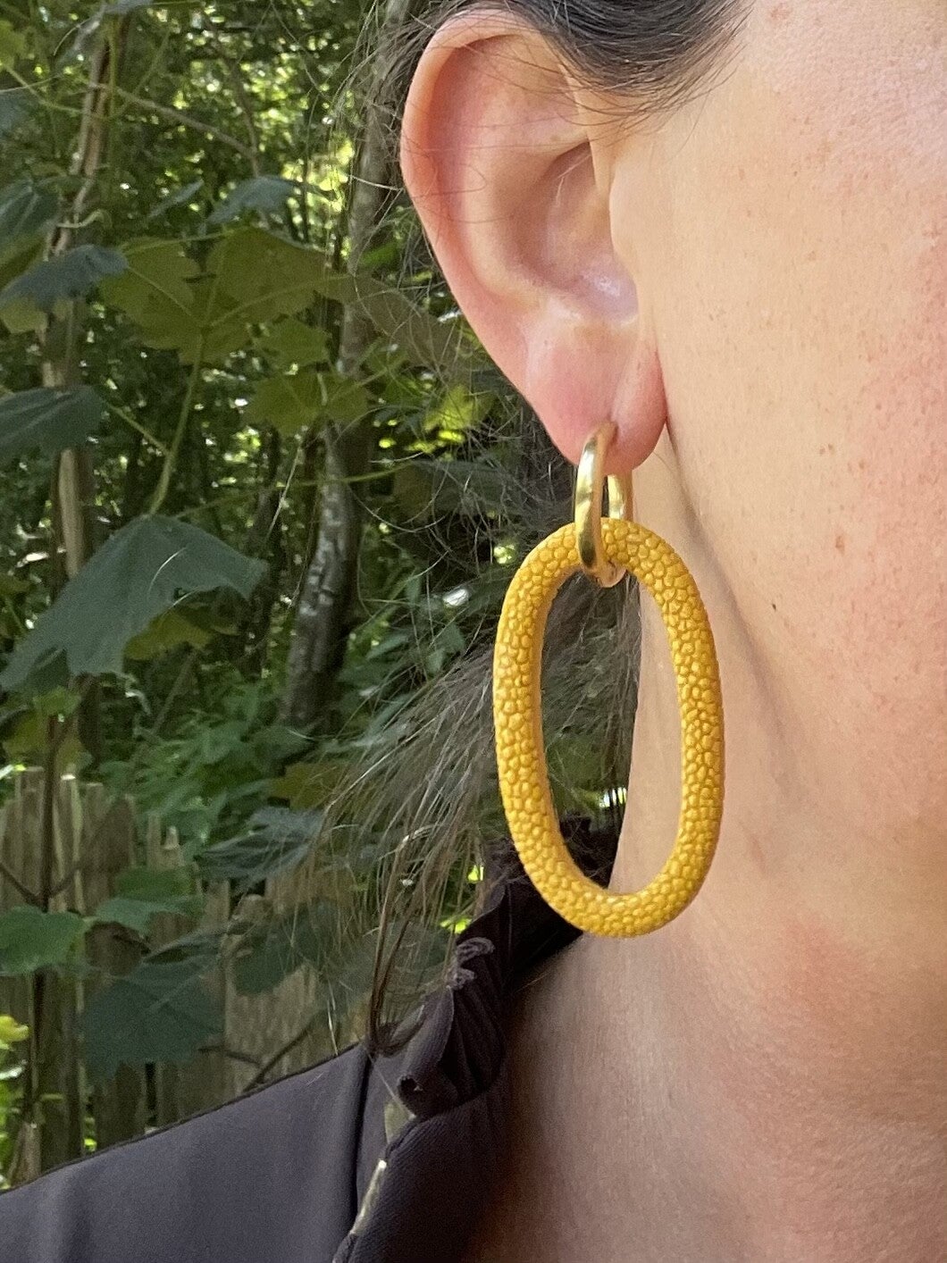 Een echte kleurrijke eyecatcher met een heerlijk slangen-achtige structuur met mat gouden creolen.