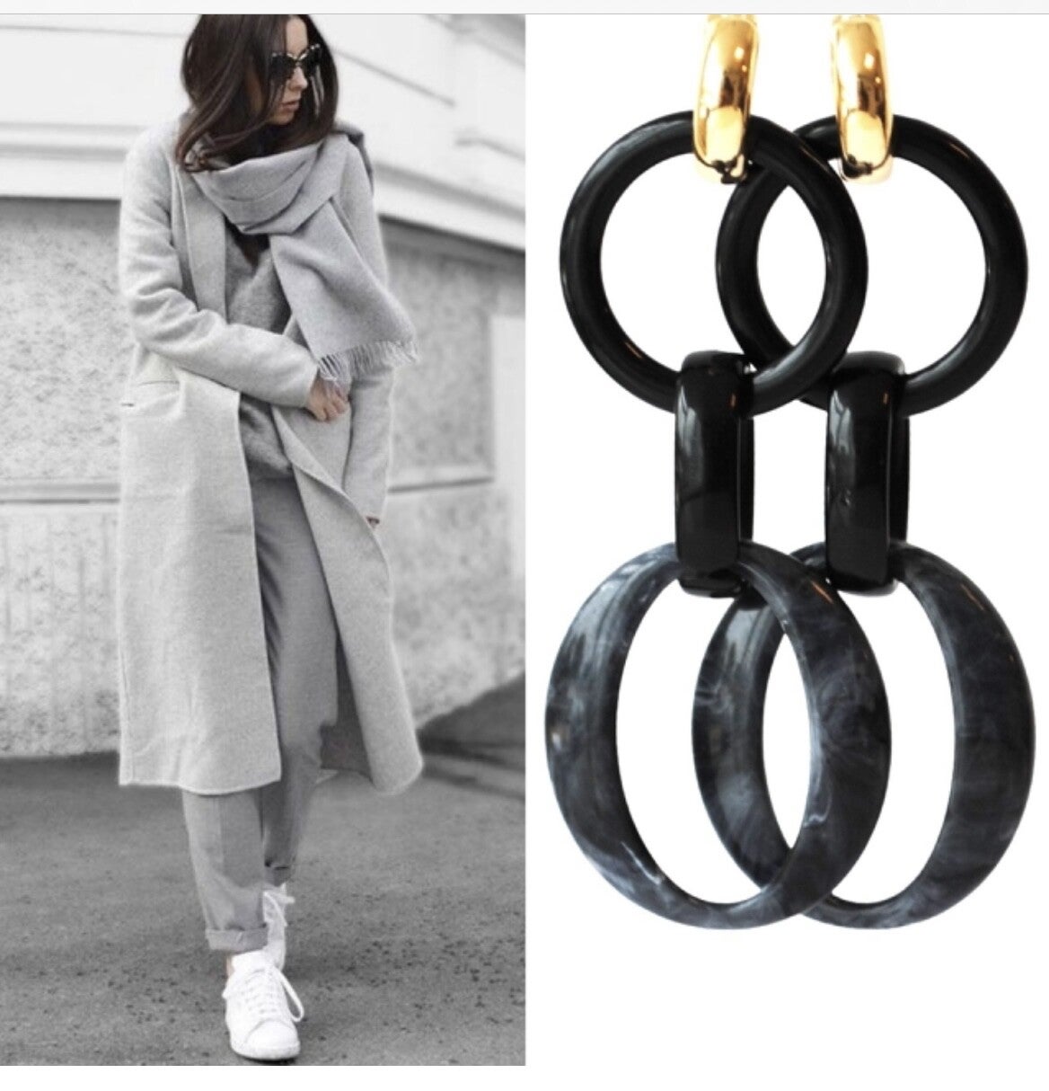 Stoere en chique oorbellen tegelijk. Echte statement oorbellen in de kleur zwart / grijs. De oorbellen bengelen heerlijk en zijn licht omdat ze van resin (hars gemaakt zijn). Deze oorbellen zijn ideaal te combineren!